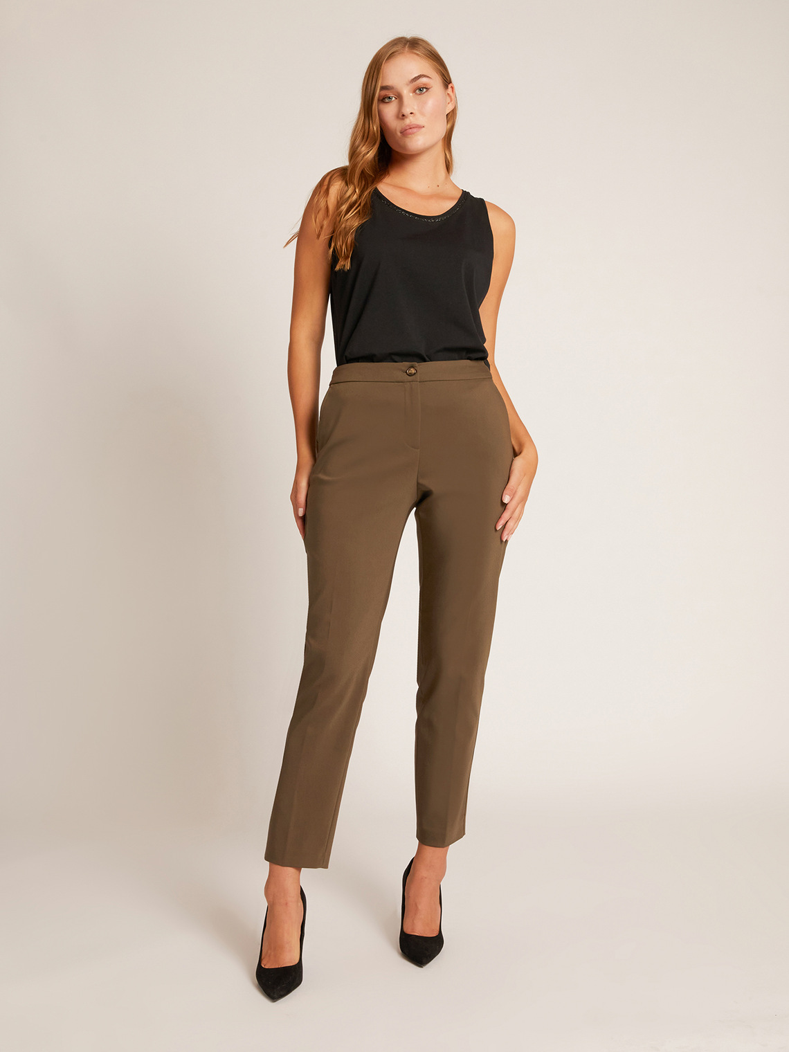 Pantaloni chinos in doppio raso, elastico inserito in vita, chiusura davanti con zip nascosta e bottone, tasche all’americana, piega stirata.