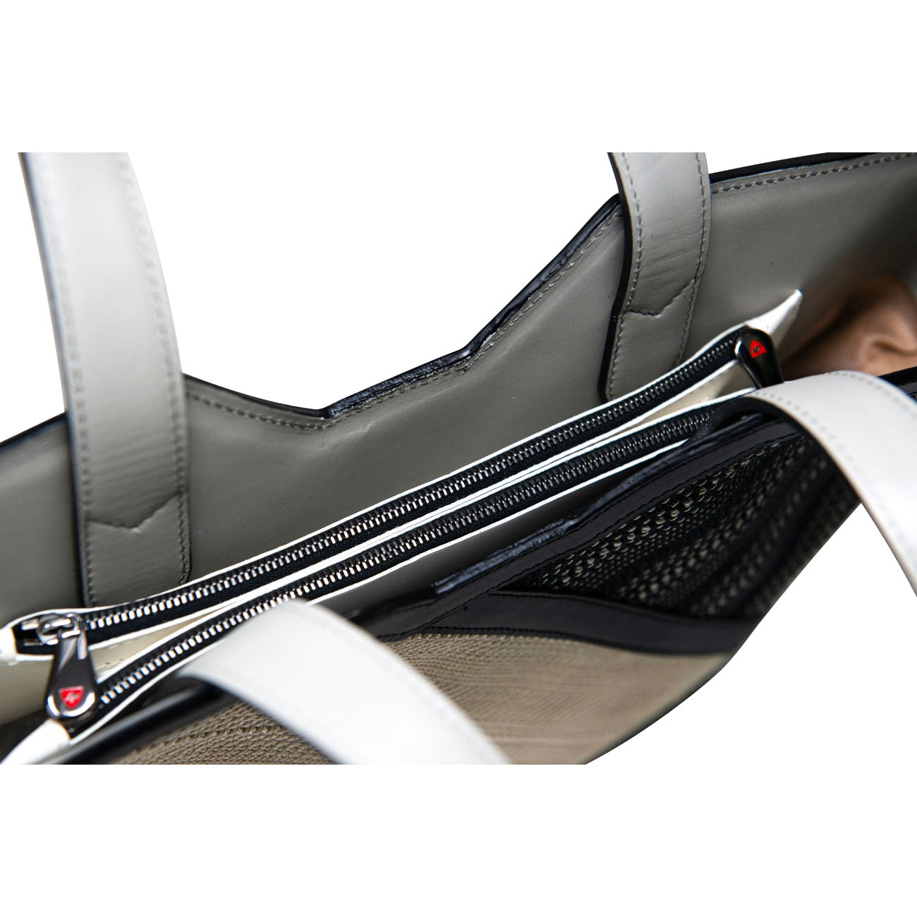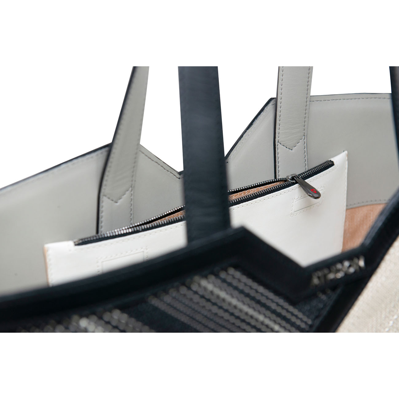 CARATTERISTICHE: due manici in pelle, chiusura a calamita, due tasche interne in pelle con logo su tirazip.